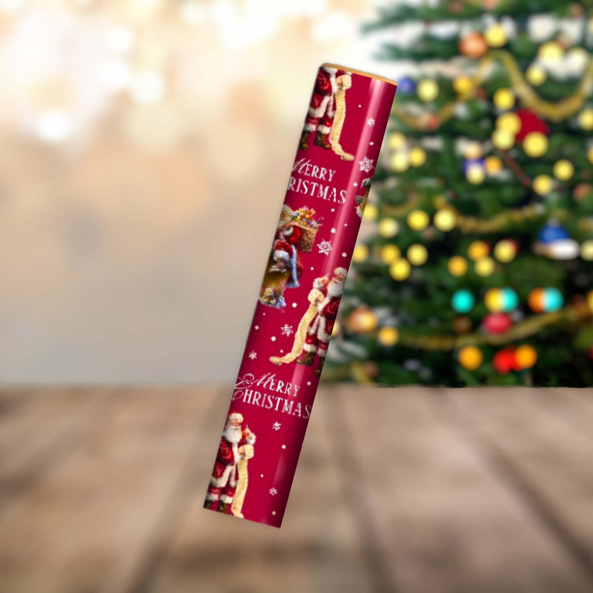 Deliver festive joy to your loved ones with our Santa with Gifts Christmas Gift Wrap Roll – a nostalgic favourite that brings the magic of Christmas to every package. This 4-metre roll features a rich red backdrop, beautifully illustrated with a traditional Santa Claus carrying his overflowing sack of gifts, surrounded by gentle snowfall and classic “Merry Christmas” gold script.