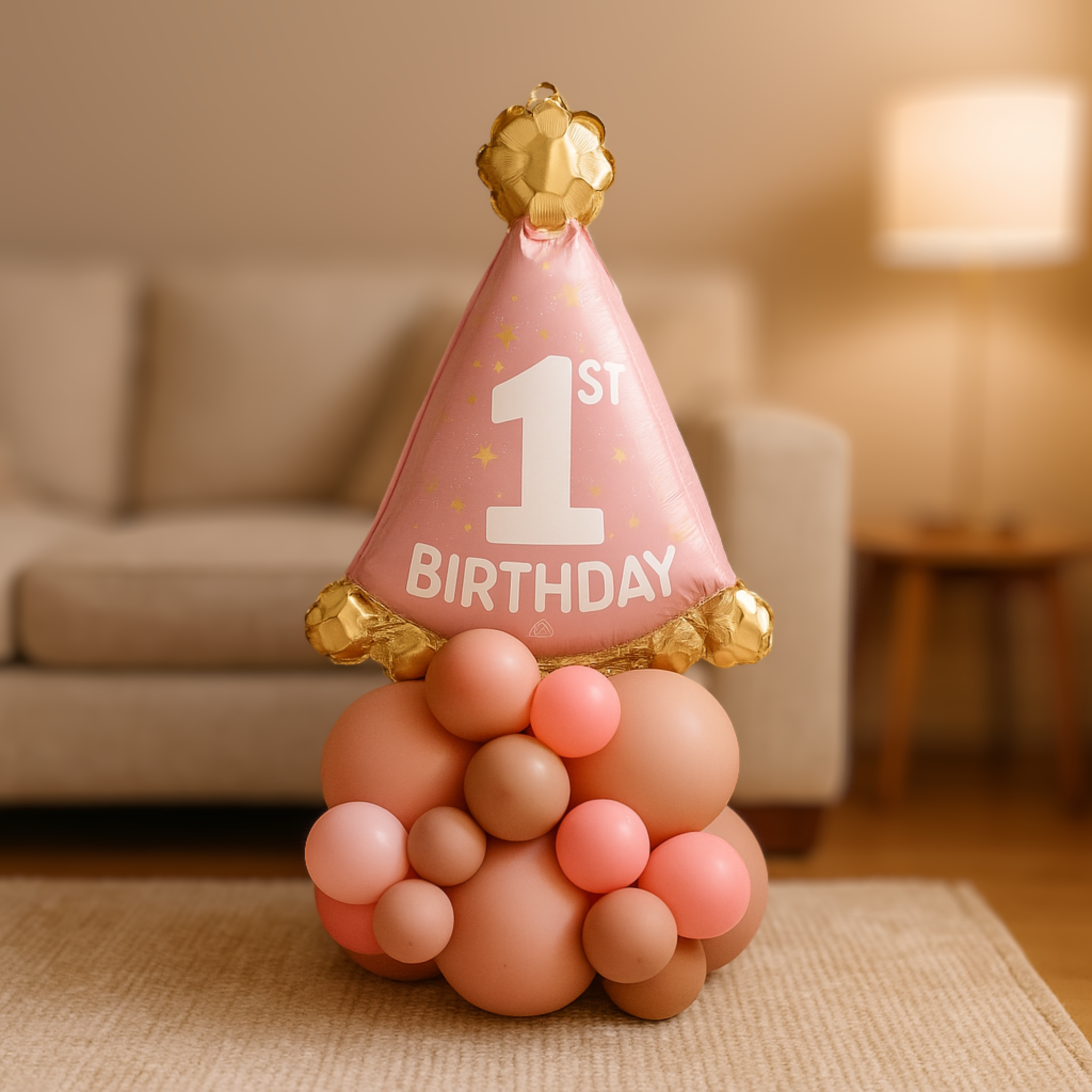 Make their very first celebration extra special with our 1st Birthday Party Hat Balloon Display – Boy or Girl, a cheerful, air-filled centrepiece that brings instant party magic without the need for helium. Each display features a large, cone-shaped “1st Birthday” foil balloon styled like a festive party hat, perfectly balanced on a handcrafted base of coordinating balloons.