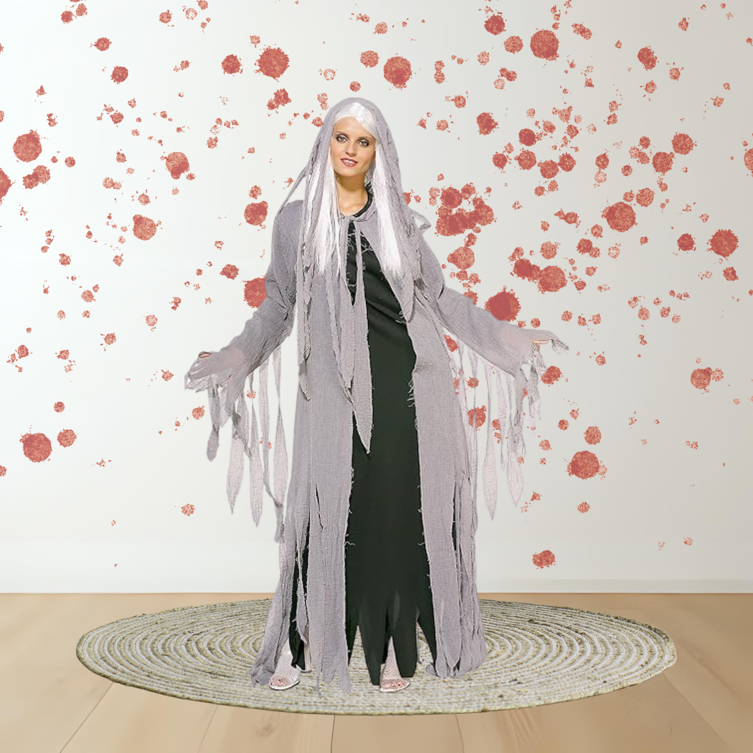 This costume includes a long black dress, attached distressed grey overlay, and matching hooded veil. Lightweight, breathable materials ensure comfort all night long — whether you’re gliding through fog or dancing under a full moon. Available in multiple adult sizes with next-day Click & Collect from our Cheltenham shop, or local delivery within a 20-mile Gloucestershire radius.